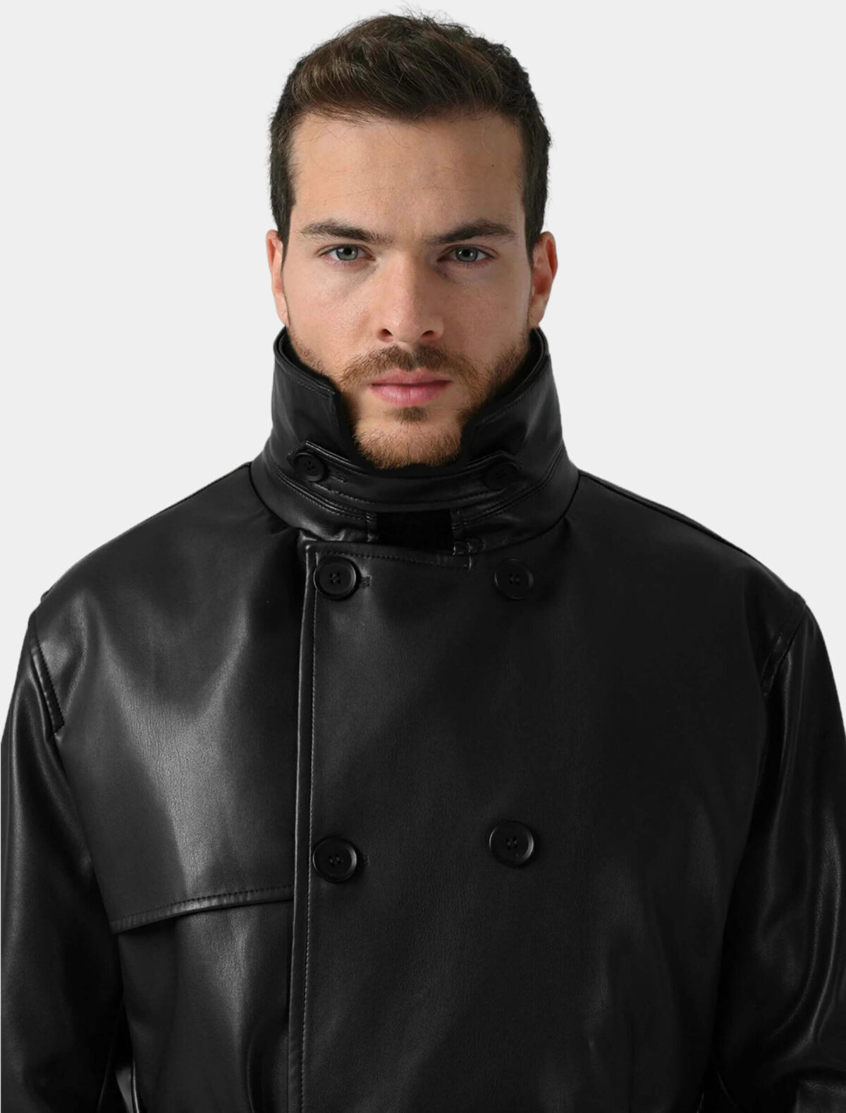 Product Details: Men’s Classic Black Double-Breasted Leather Trench Coat