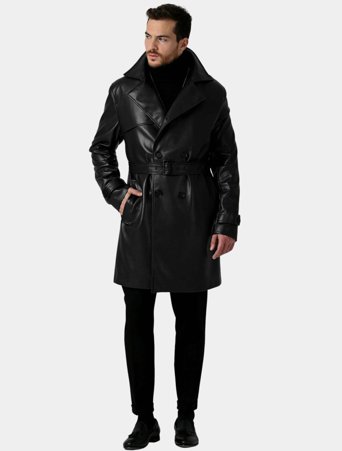 Men’s Classic Black Double-Breasted Leather Trench Coat