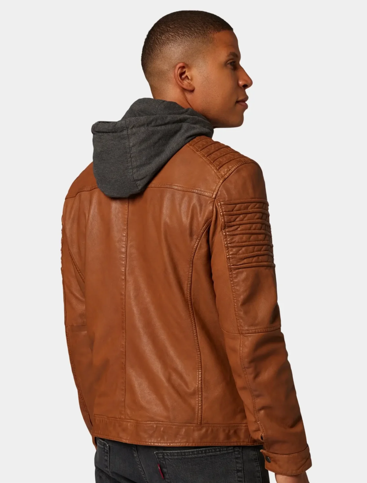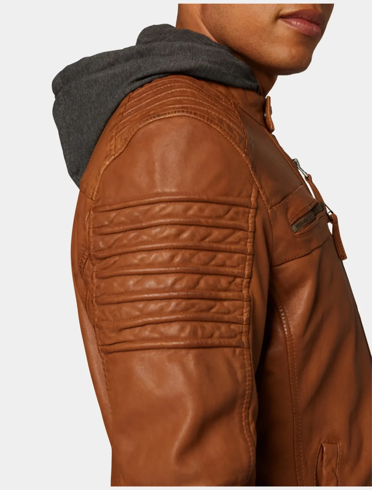 Core Details of: Slim fit Men’s Tan Hooded Café Racer Leather Jacket