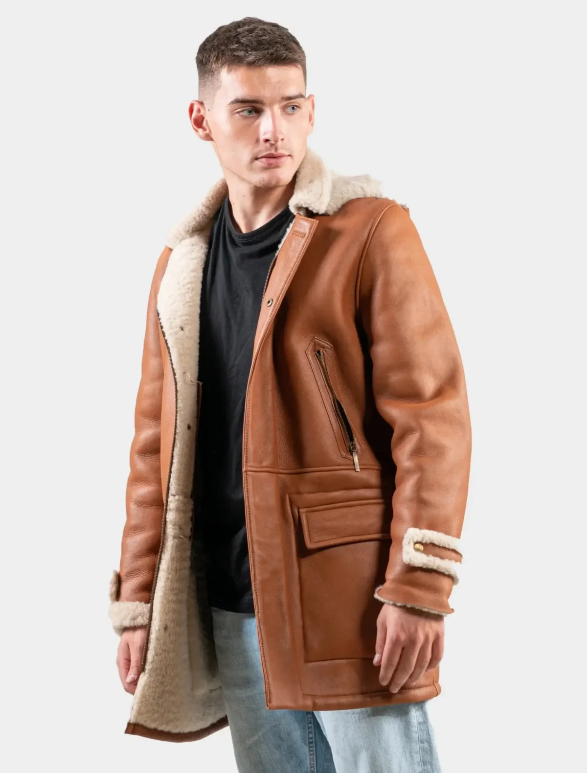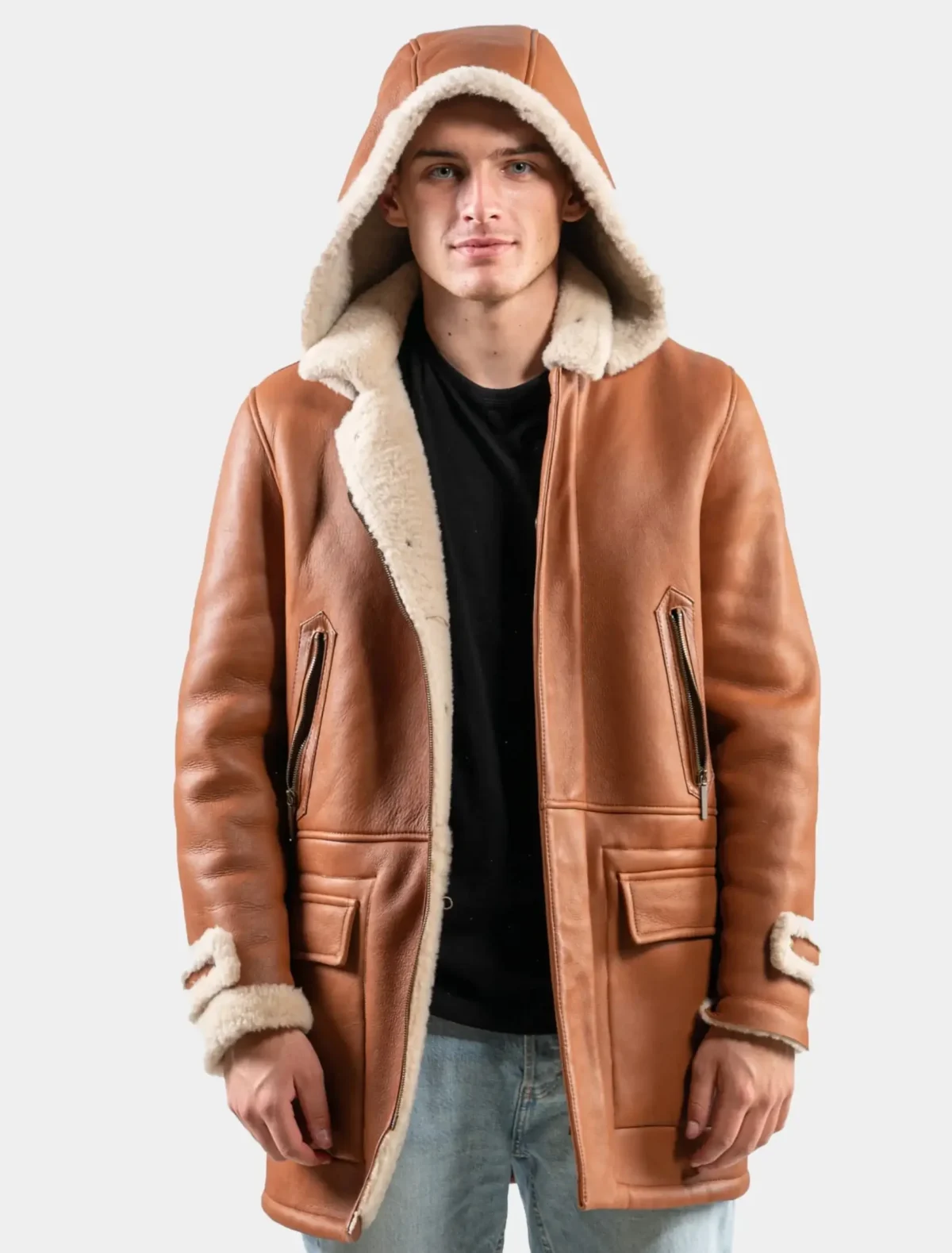 Elevate your cold-weather style with the rugged charm and sophisticated detailing of the Men’s Classic Tan Leather Hooded Shearling Trench Coat. This outerwear piece isn’t just another winter layer—it’s an investment in year-round style, superior warmth, and long-lasting craftsmanship. Whether you’re heading into the city or escaping into the mountains, this coat has the presence, performance, and durability to match your pace. Its commanding length, refined tan hue, and luxurious shearling lining are made for the man who wants warmth without sacrificing sophistication.
