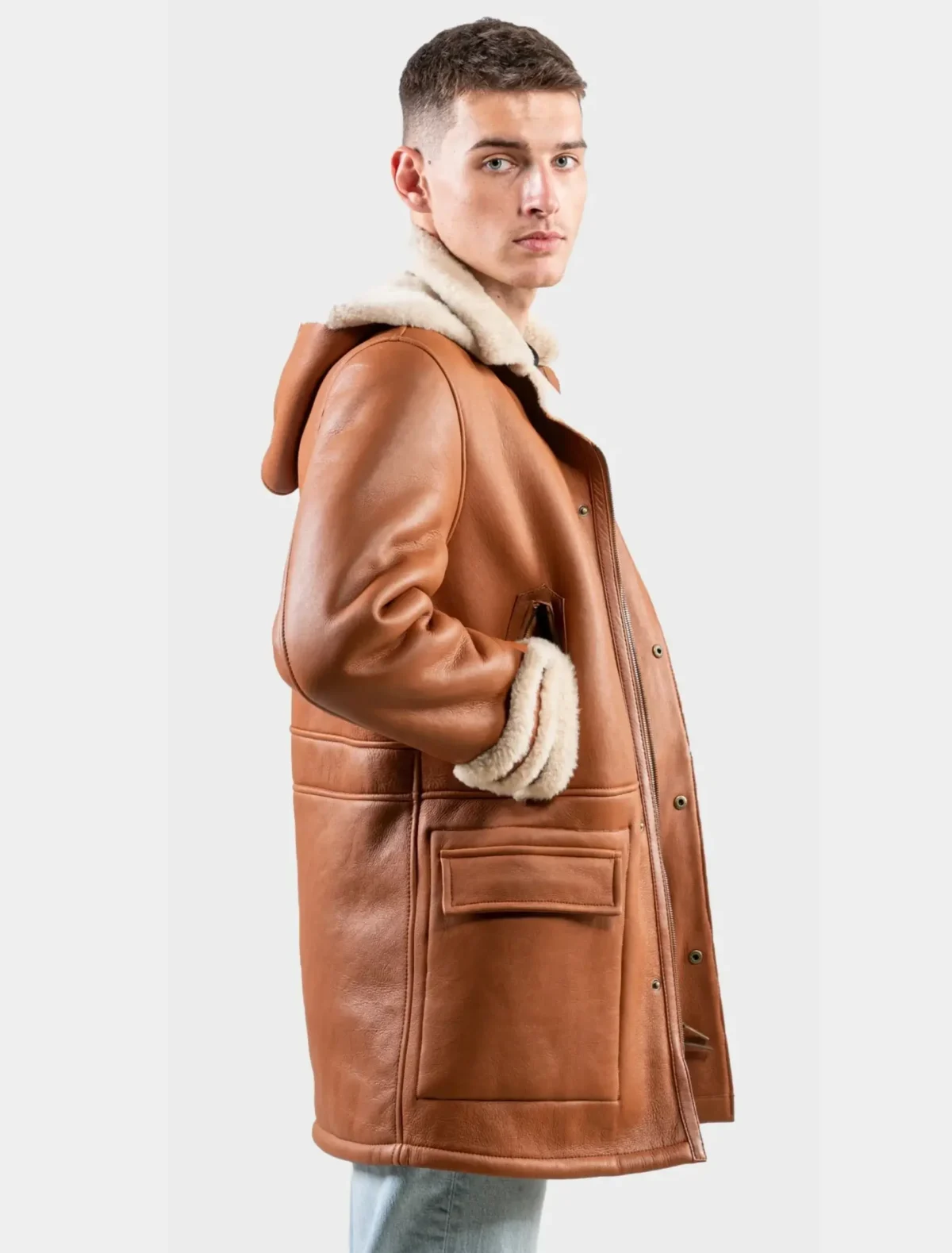 This coat isn’t just stylish—it’s built for real-world functionality. The Men’s Classic Tan Leather Hooded Shearling Trench Coat stands up to harsh winters while adding a confident finish to your wardrobe. Whether paired with jeans or wool trousers, its versatility makes it a go-to choice for men who value quality and polish in every outfit.