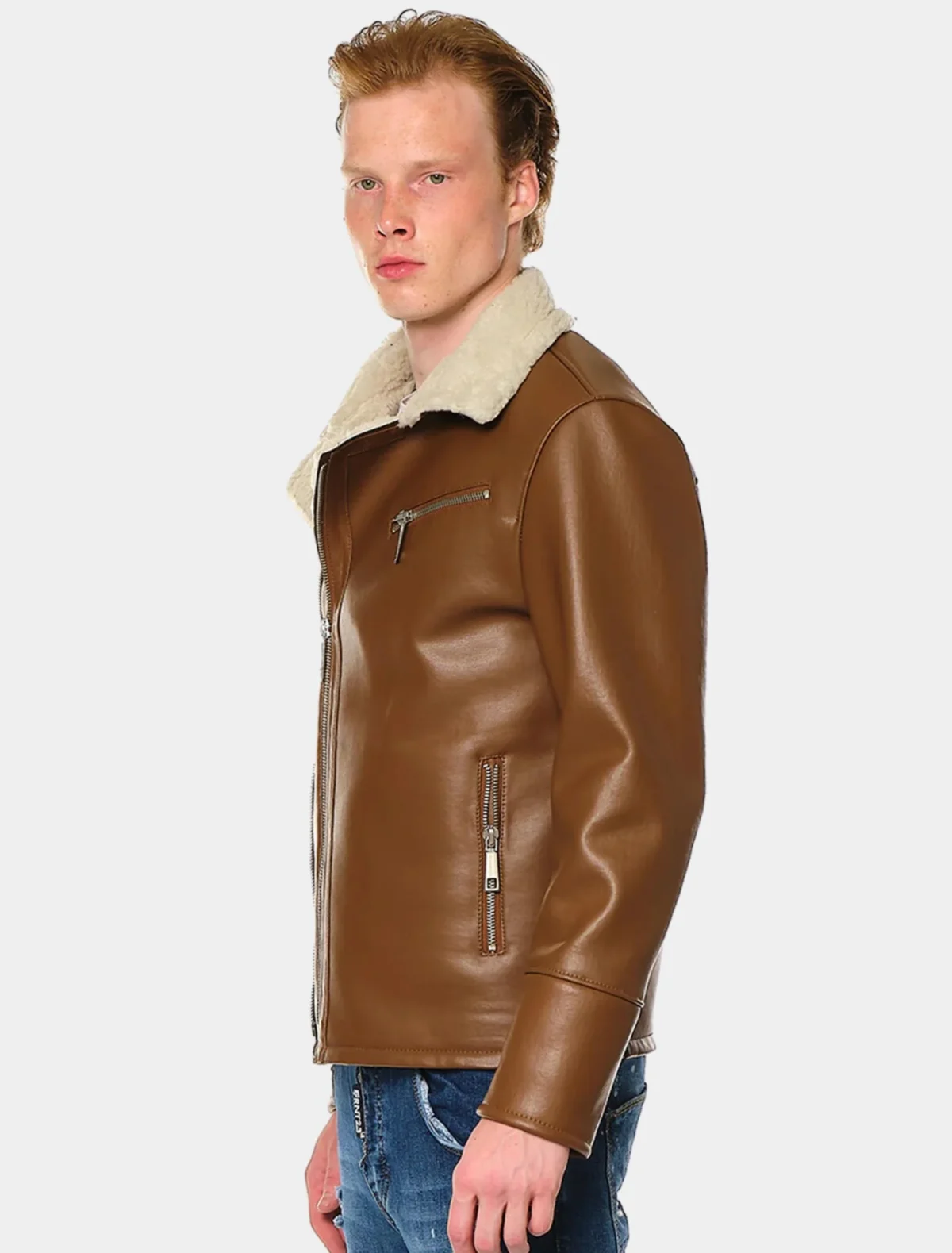 Product Details: Men’s Moto Brown Faux Leather Shearling Jacket