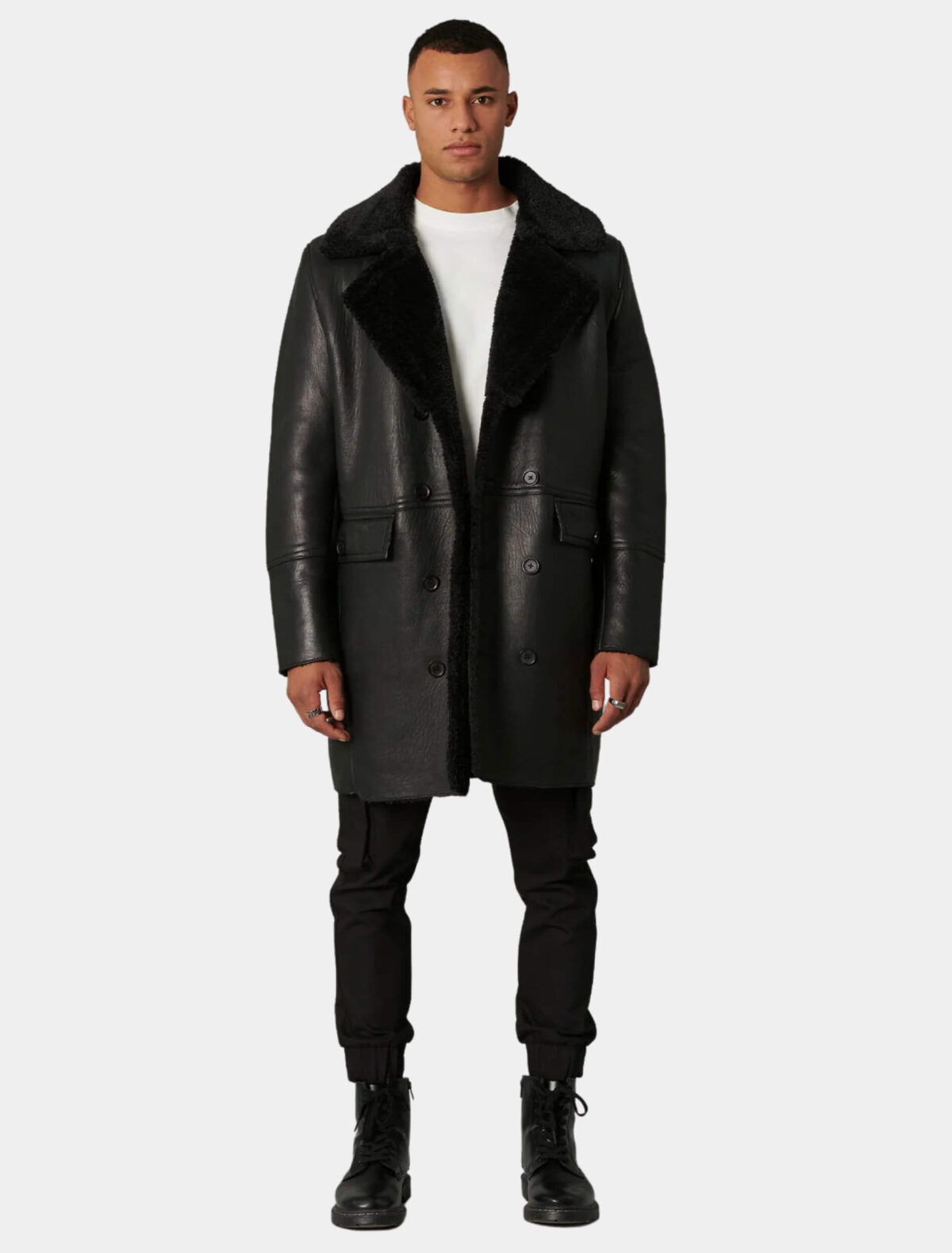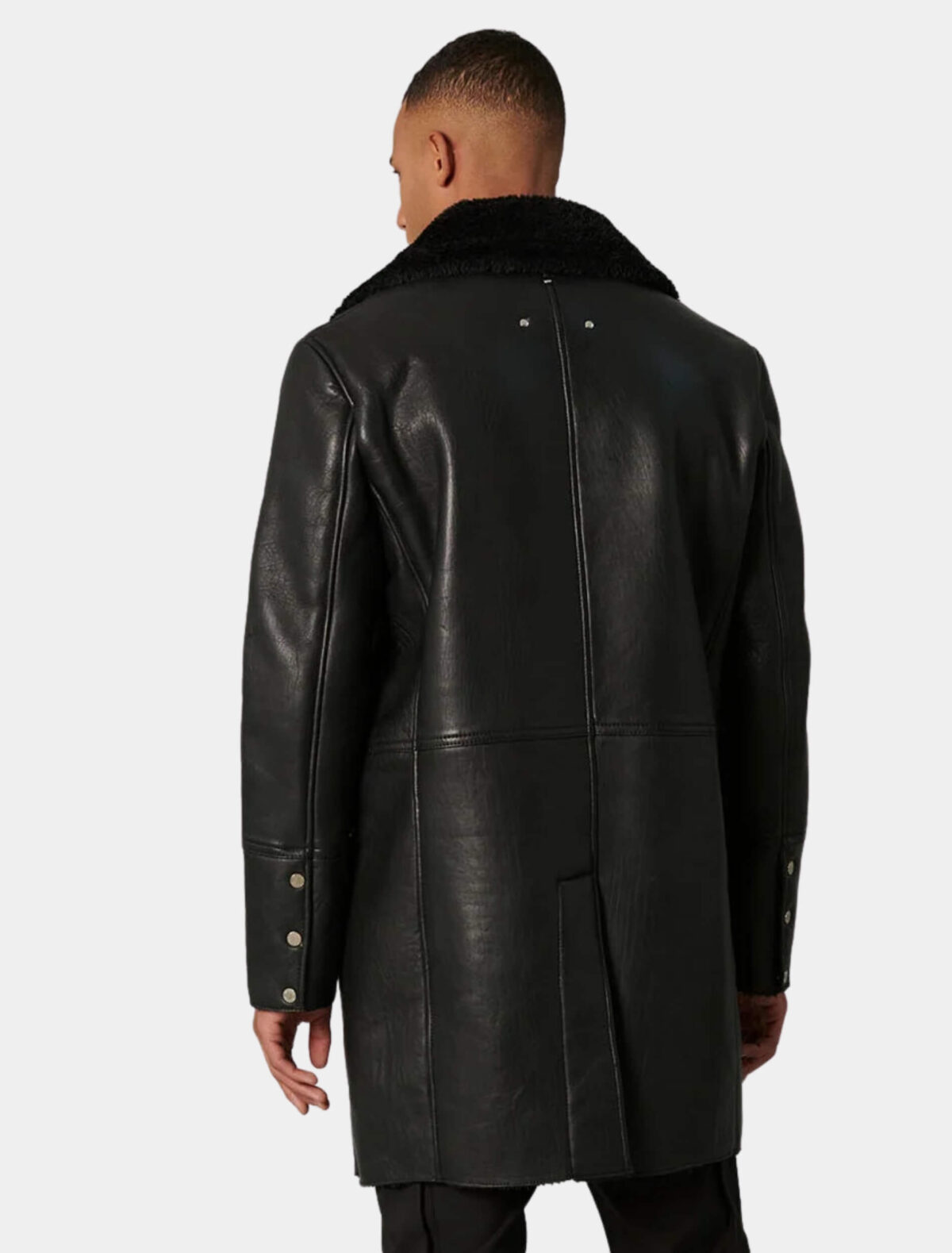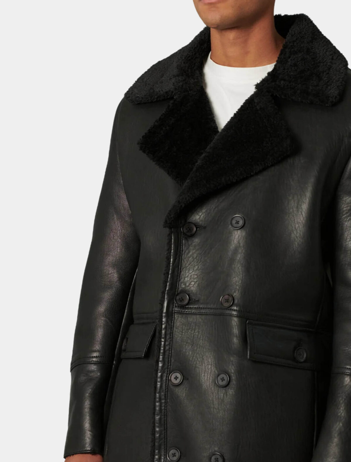 All the Details: Men’s Black Leather Double Breasted Shearling Trench Coat