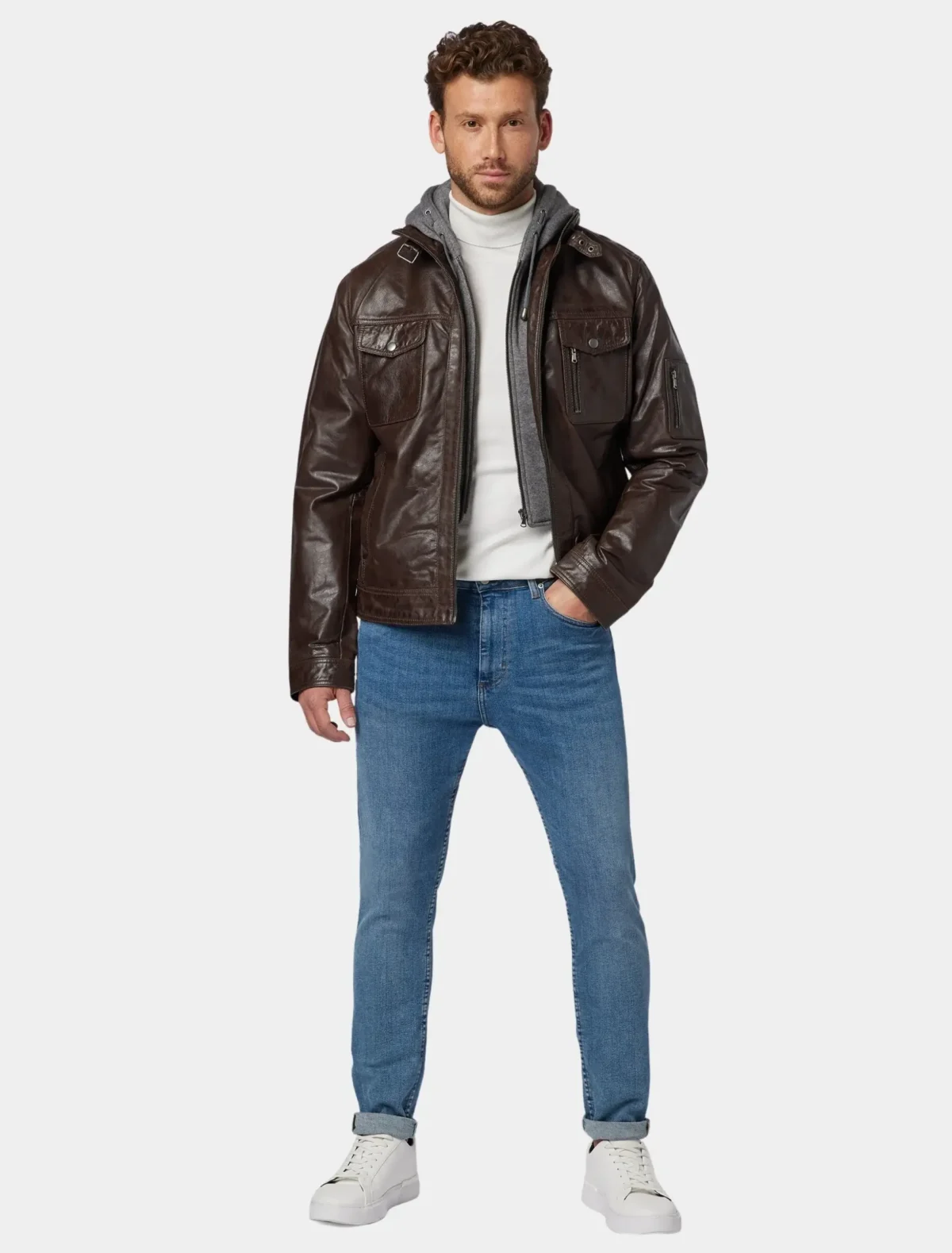 2. All-Weather Ready – With water-resistant leather and a wind-defensive hood, this jacket delivers in both urban and rugged conditions.